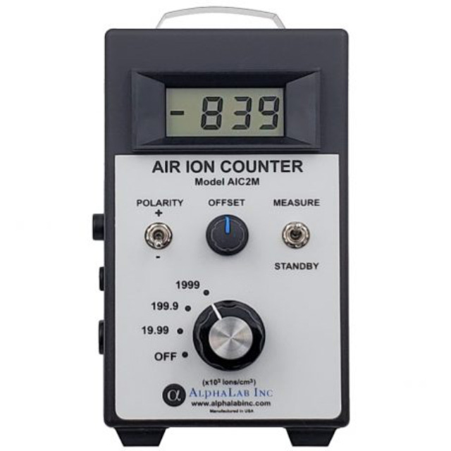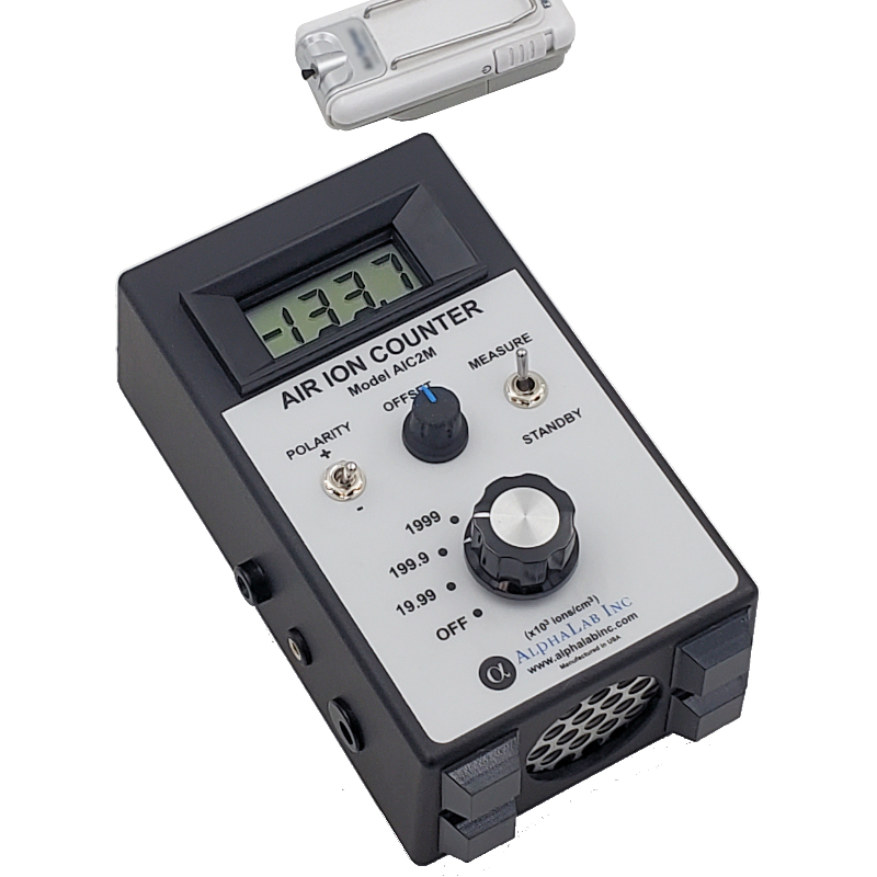 空氣離子計數器是一種手持式儀表,用于測量離子密度——空氣中每立方厘米(離子/立方厘米)的離子數量。它分別測量正離子和負離子(+和-離子通常同時存在)。該儀器是一個真正的離子密度計,基于Gerdien管(Gerdien冷凝器)設計,它包含一個風扇,以校準的速率將空氣通過儀表。標準模型測量高達200萬個離子/立方厘米(相比之下,室外空氣通常有100到1000個離子/立方厘米,包括+和-)。200萬的范圍足以滿足幾乎所有情況,除了測量非常接近電電離器或強放射源。對于這些應用,也可提供范圍為2000萬和2億離子/cc的型號。包括AC適配器。