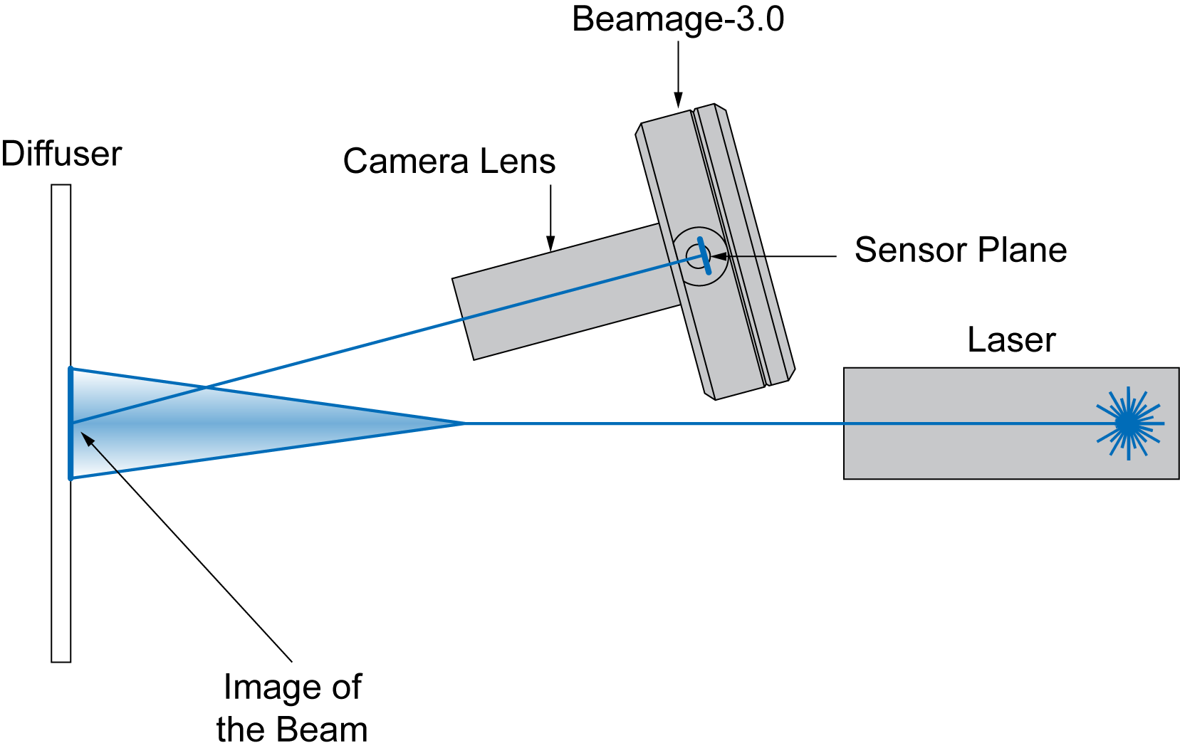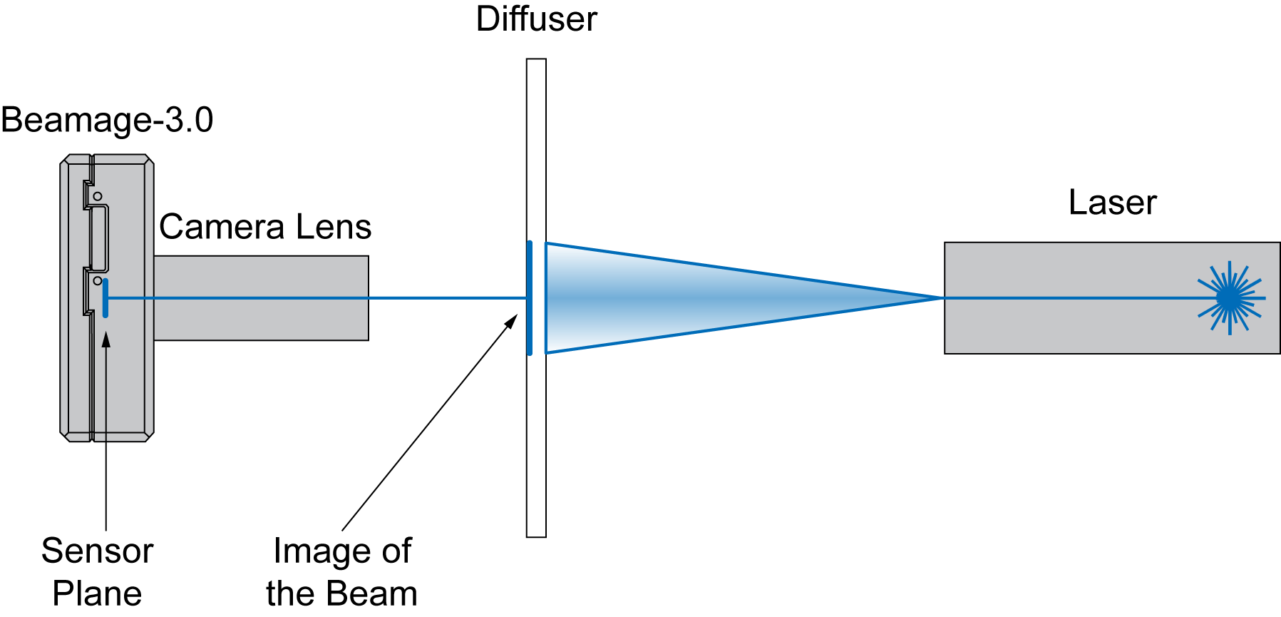 CL 系列相機鏡頭的工作原理是在光束射入漫射元件之后,間接對光束的反射或透射進行成像。對于較大光束,只需增加漫射體與 BEAMAGE 之間的距離。