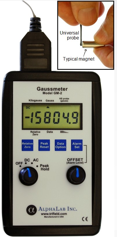 GM2 型設(shè)計(jì)用于測(cè)量強(qiáng)磁場(chǎng)和中等磁場(chǎng),例如來(lái)自磁鐵和螺線(xiàn)管的磁場(chǎng). 它使用起來(lái)快速直觀(guān),具有極高的動(dòng)態(tài)范圍,測(cè)量范圍為 0.0 至 19,999.9 高斯,步長(zhǎng)為 0.1 高斯。大于 20000 高斯時(shí),范圍會(huì)自動(dòng)更改,讀數(shù)為 20.000 至 29.999 千高斯(20000 至 29999 高斯),步長(zhǎng)為 1 高斯。因此,可以測(cè)量小至 0.1 高斯的變化,例如,在 14,000 高斯場(chǎng)(典型的永磁體強(qiáng)場(chǎng))中。通過(guò)可選的高穩(wěn)定性探頭,它具有 0.01 高斯分辨率。(高穩(wěn)定性探頭范圍為 +/- 799.99 高斯)。GM2 還可以測(cè)量高達(dá) 10,000 高斯的交流場(chǎng)。快速峰值保持功能(2 毫秒窗口)捕獲并顯示任何瞬變,無(wú)論是正的還是負(fù)的。此外,可以根據(jù)需要選擇兩種快速(2 毫秒)報(bào)警功能中的任何一種。