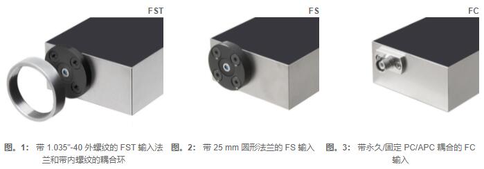 兼容光學平臺(自由空間)和光纖自由空間輸入設計為帶螺紋耦合環的 1.035"-40 螺紋法蘭 (FST) 或無螺紋的 25 mm 圓形法蘭 (FS)。這兩種類型都與來自不同制造商的光學配件廣泛兼容,例如透鏡、管、籠式系統、光學適配器等。