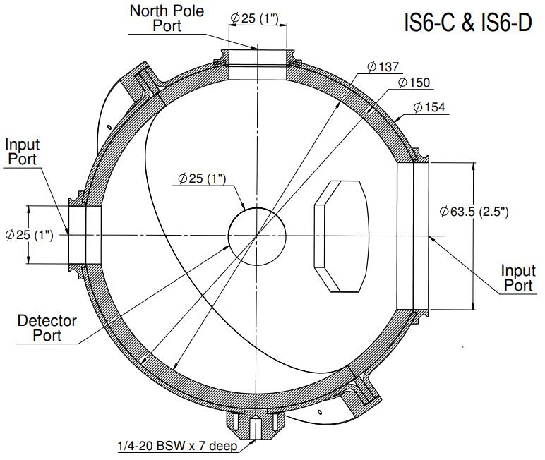 IS6-D 是一個 6” 積分球(內部 5.3”),用于發散 (D) 光束。它沒有檢測器,IS6-D 的檢測配置由用戶完成。也可作為均勻光源使用。
