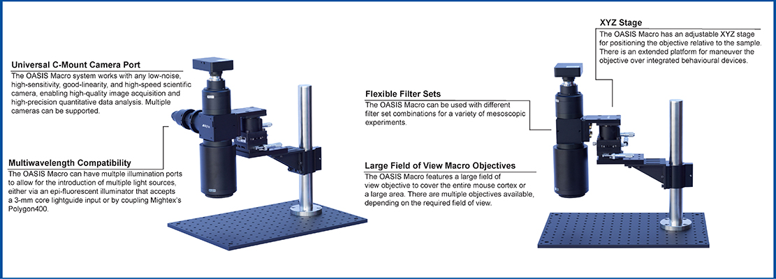OASIS Macro 旨在對頭部固定小鼠的整個(gè)皮層或清醒動物的大皮層區(qū)域的數(shù)千個(gè)神經(jīng)元群的活動進(jìn)行成像。與傳統(tǒng)顯微鏡相比,與OASIS Macro兼容的鏡頭提供了更大的視野。