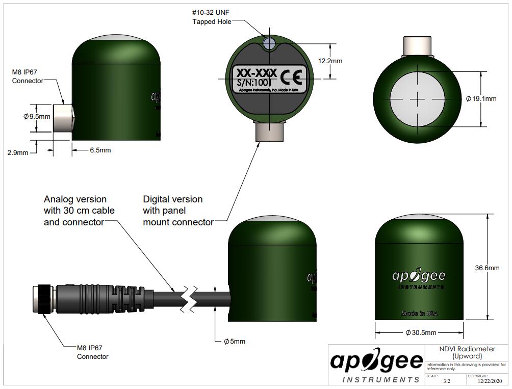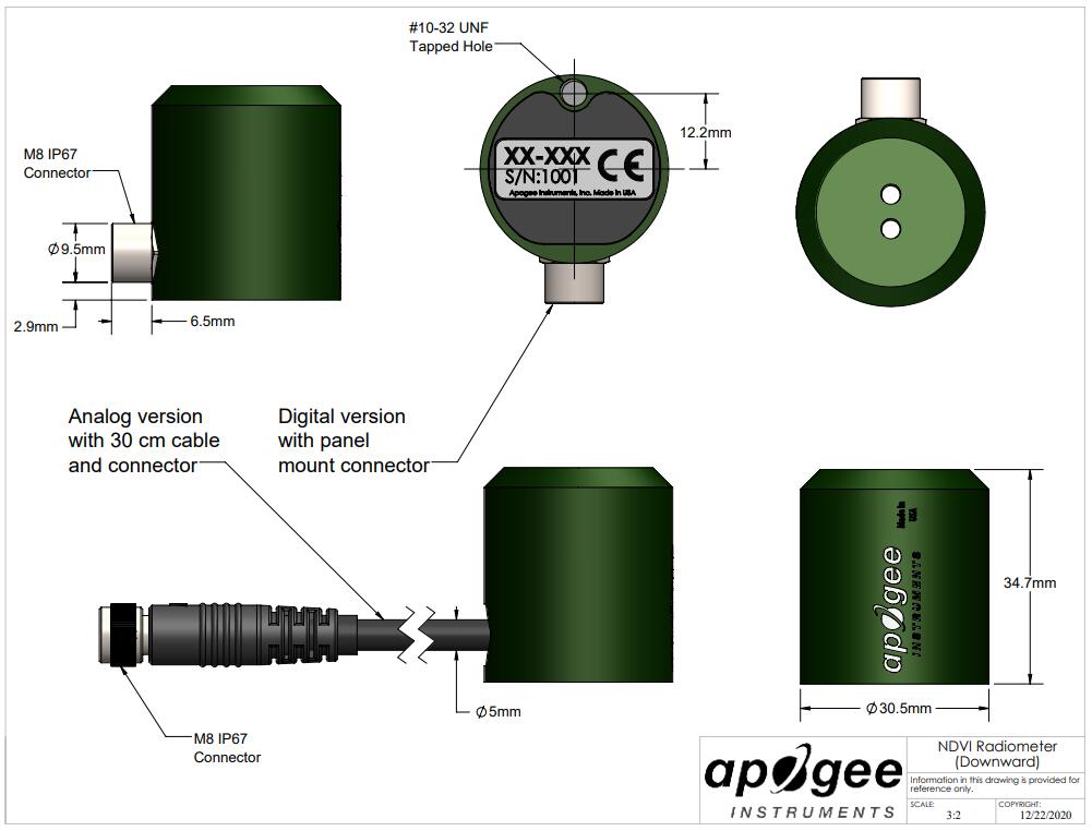 該傳感器的模擬版本 (S2-111) 帶有內聯電纜連接器,距離傳感器頭 30 厘米,可作為長電纜尾纖傳感器標準使用,或通過擰下連接器與我們的 microCache 藍牙微型記錄器一起 使用,丟棄較長的電纜,然后將傳感器擰到 microCache 上的配合連接器上。
