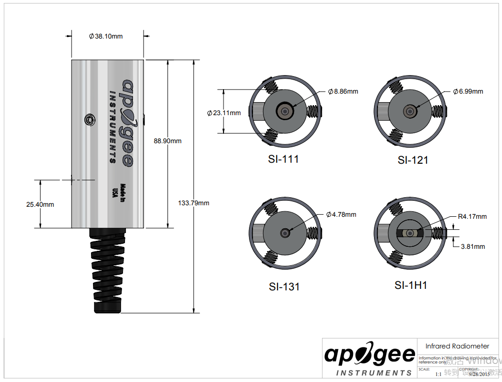 SI-4H1 具有SDI-12數字輸出和高質量電纜,端接在預鍍錫尾纖引線中,便于連接到數據記錄器和控制器。傳感器獨特的幾何形狀在水平方向上提供了32°的寬半角度視場,在垂直方向上提供13°的半角度視場。這使得用戶能夠以較淺的角度安裝傳感器,而不會看到地平線上方,同時盡可能的擴大化測量的面積。傳感器的響應時間為0.1秒。典型的應用包括用于植物水分狀況估計的植物冠層溫度測量、用于確定結冰條件的路面溫度測量以及用于能量平衡研究的地表(土壤、植被、水、雪)溫度測量。傳感器包括IP68 不銹鋼電纜連接器,距離頭部30厘米,以簡化傳感器的拆卸和更換,便于維護和重新校準。SI-4H1-SS設計用于安裝遠地點AM-250商用安裝支架。