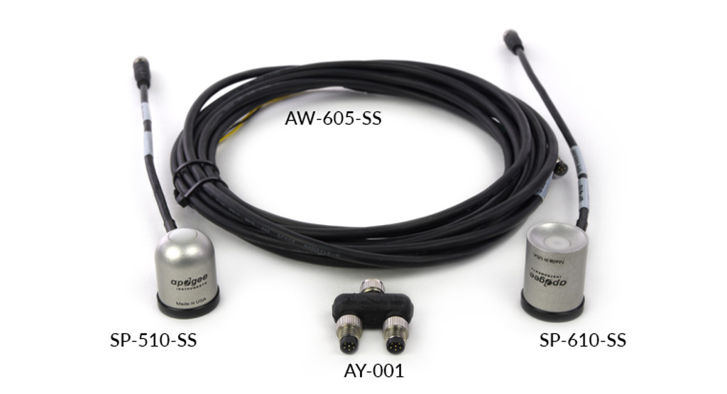 SP-710:反照率計傳感器包包括一個 SP-510-SS 熱電堆總輻射表(向上看)、一個 SP-610-SS 熱電堆總輻射表(向下看)、一個AY-001差分分路器和一條 AW-605-SS 5 米電纜。