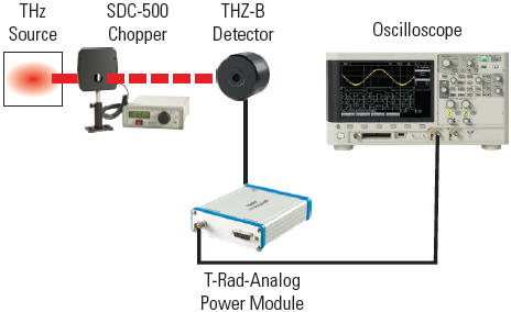 這是一種基本模擬設置,在輻射源的光功率約為 5 微瓦或更大的情況下比較有用。在 5 赫茲斬波頻率下,THZ5B-BL-DA 探測器的輸出約為 600 毫瓦,可為示波器提供充足的信號。只需讀取電壓輸出,再除以探測器的 Rv 系數 (V/W),即可測量出輻射源的強度(單位:瓦)。在特定情況下,還可考慮使用波長糾正系數。