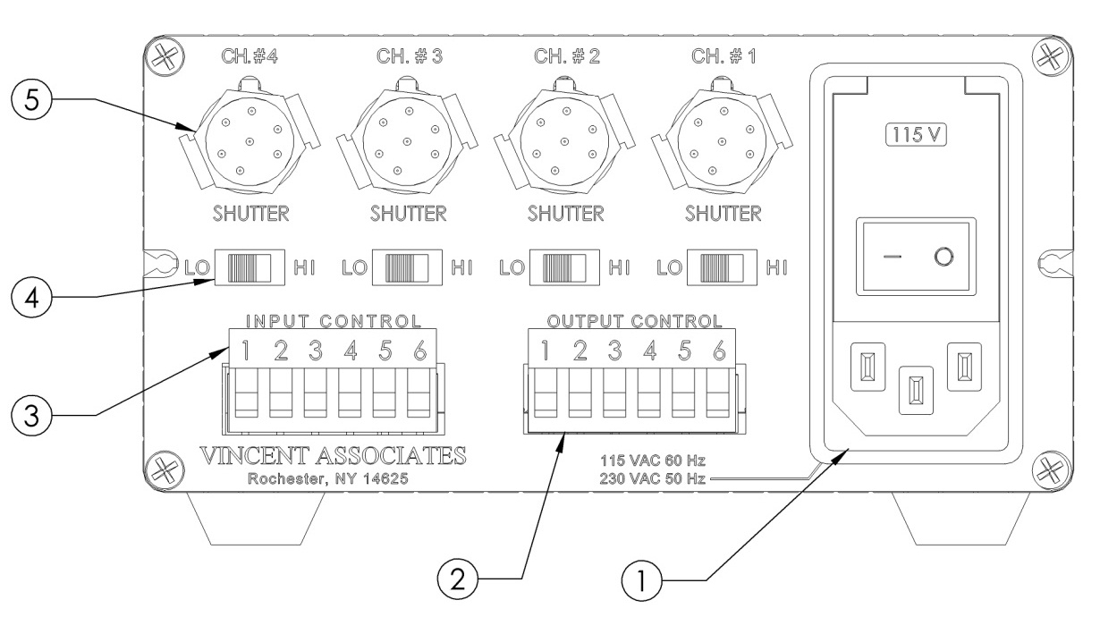 | 輸入控制 (3) | 為每個通道提供高電平有效控制。輸入 TTL 高電平 – 快門打開,輸入 TTL 低電平 – 快門關(guān)閉。端子 #5 – 高電平有效,輸入 TTL 高電平 – 所有快門打開,輸入 TTL 低電平 – 所有快門關(guān)閉。請參閱 VMM-D3/D4 用戶手冊第 15-19 頁中的端子排布局。 |