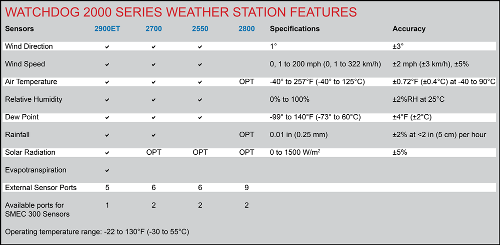 WatchDog 2800 工作站非常適合需要多個傳感器測量溫度、土壤濕度、作物冠層光照或葉片濕度數據的情況。通過選擇多達 8 個插入式傳感器以及 1 個可選的雨量傳感器,根據您的應用定制電臺。2800 Station 具有與其他 WatchDog Station 相同的內存、電源和 LCD,并接受相同的通信設備和傳感器。需要 SpecWare Pro 軟件。
