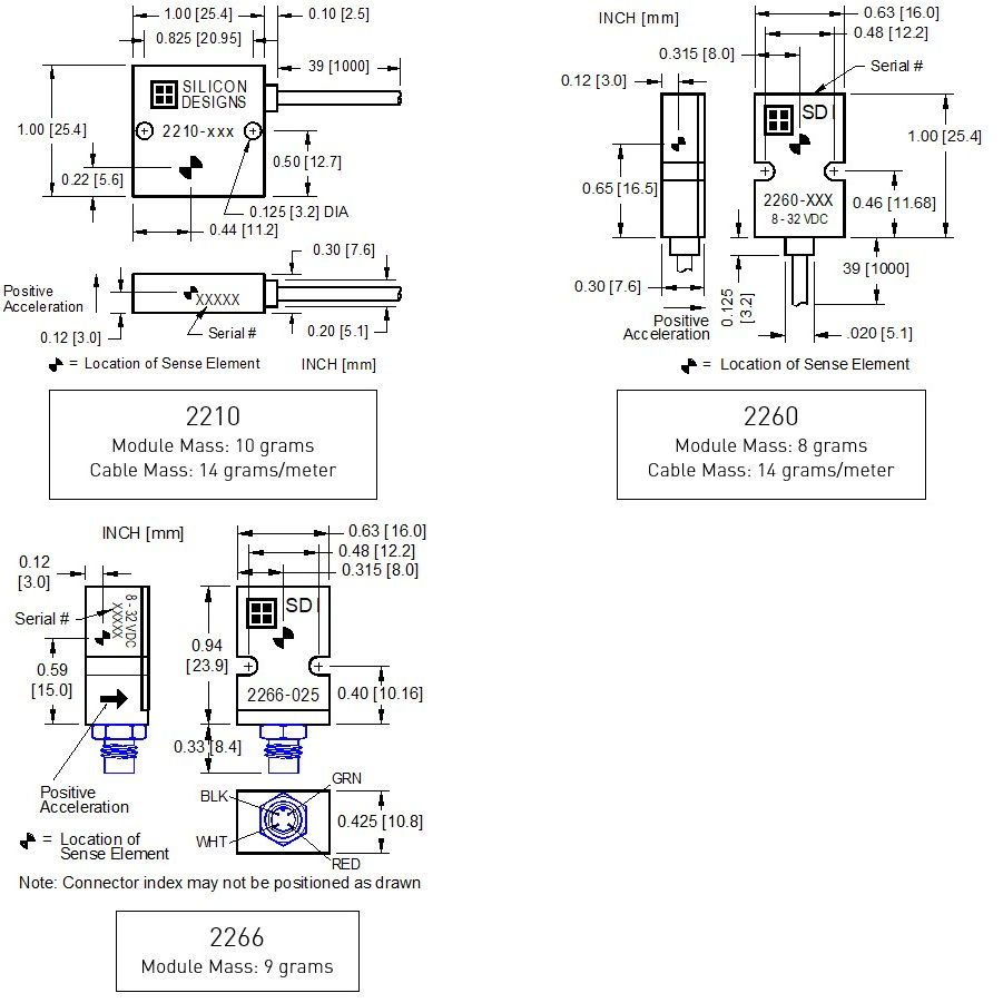 The 2210 comes in a traditional 1-inch square package and the 2260 and 2266 are the small footprint devices designed for tight spaces. The 2210 and 2260 feature an integrated 3’ cable, while the 2266’s connector allows for customized cable lengths and easy repositioning. All three models feature a hermetically sealed, low noise SDI surface mount accelerometer, which is individually tested, programmed, calibrated by SDI.