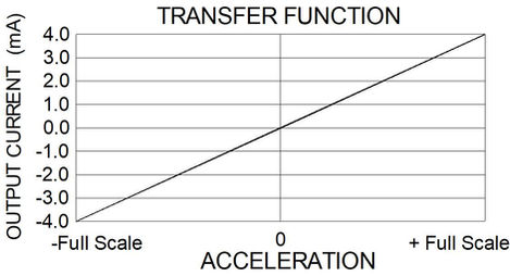 The Model 2225 generates an output current, the value of which varies with acceleration as shown in the adjacent figure.