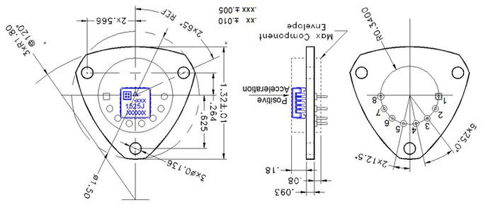 The model 2225 input axis is perpendicular to the PCB. The seismic center is located at the center of the PCB inside the LCC accelerometer, approximately 0.110 inches (2.75 mm) above the top of the PCB, the reference surface for the 2225.