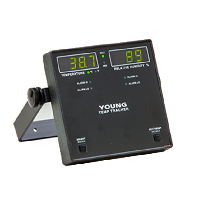 The YOUNG Model 46203 Temp Tracker is a compact temperature and humidity/dew point display with advanced alarm features for use in a wide range of applications. Compatible with YOUNG Models 41342LC Temperature Probe or 41382LC2 Relative Humidity/Temperature Probe that provides 4-20 mA inputs (-50 to +50 C), it can be set to display in either Celsius or Fahrenheit. Minimum and maximum values are continually updated and can be viewed by the press of a button. The display includes calibrated voltage outputs, an RS-485 serial output for connection of multiple displays, and programmable alarms. Brightness control allows adjustment for best viewing in any light. The Temp Tracker is very compact for easy mounting on vertical bulkheads or wall surfaces.