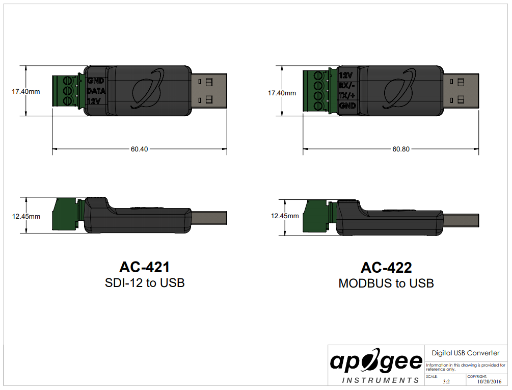 One side of the AC-422 features a USB connection for plugging into a computer. The other side of the AC-422 has +12 V out, GND, and Modbus data channels for connection to any standard Modbus sensor (for proper operation, please connect the ground wire first).