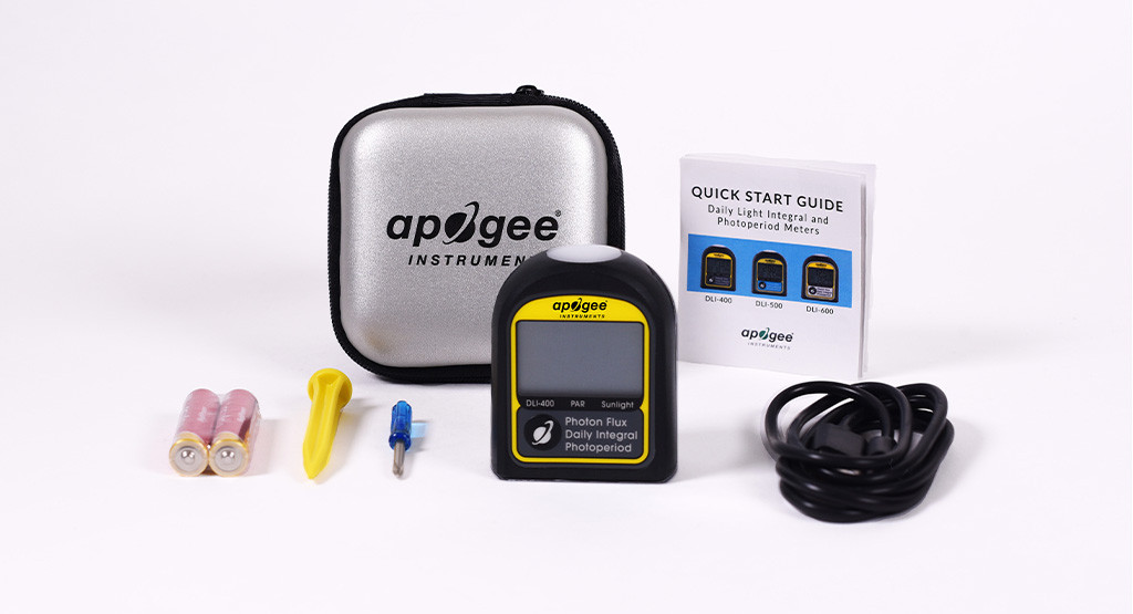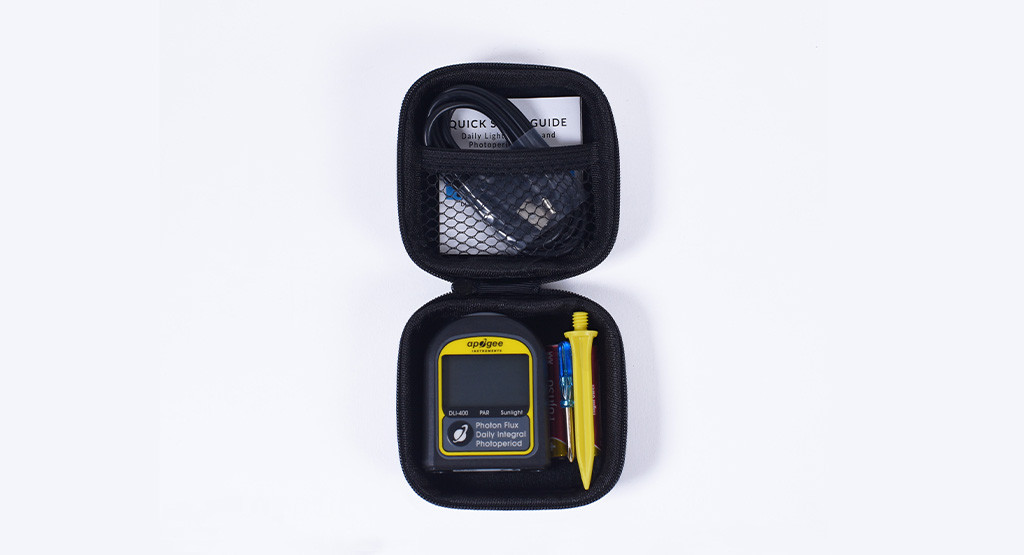 Rugged and ready to use:The DLI-400 is sturdy and durable, with the protection level of IP65, and can withstand harsh and humid environments. It can be carried around for spot check, placed directly on any horizontal surface, or connected to the commonly used camera tripod, fixture, or the standard used at the bottom ?- 20 threaded ports. The DLI instrument consists of a cast acrylic diffuser (filter), an optical filter, a photodiode, a signal processing circuit, and an LCD display mounted in the ASA plastic housing.Each DLI package includes the instrument, a protective suitcase, two AAA batteries, a quick start guide, a screwdriver, a soil nail for easy installation, and a USB-C cable for downloading the data stored in the instrument to the computer as a CSV file.