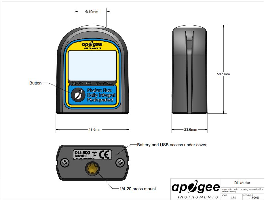 Rugged and ready to use: The DLI-600 is sturdy and durable, with the protection level of IP65, and can withstand harsh and humid environments. It can be carried around for spot check, placed directly on any horizontal surface, or connected to the commonly used camera tripod, fixture, or the standard used at the bottom ?- 20 threaded ports. The DLI instrument consists of a cast acrylic diffuser (filter), an optical filter, a photodiode, a signal processing circuit, and an LCD display mounted in the ASA plastic housing. Each DLI package includes the instrument, a protective suitcase, two AAA batteries, a quick start guide, a screwdriver, a soil nail for easy installation, and a USB-C cable for downloading the data stored in the instrument to the computer as a CSV file.