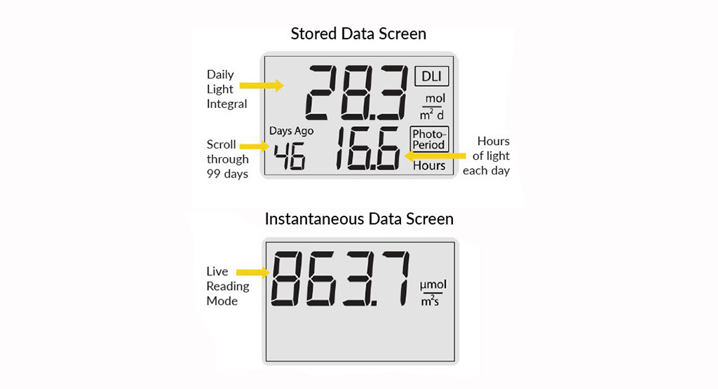 | Data Log Capacity | 99 days (DLI & Photoperiod), 10 days (30 min PPFD/ePPFD averages) |