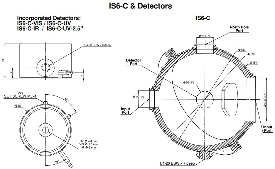 The IS6-C-VIS is a 6” integrating spheres (5.3” inside) with a Silicon detector for use with collimated (C) beams. The IS6-C-VIS comes with a VIS detector, is calibrated from 400 to 1100nm and can measure up to 30W.
