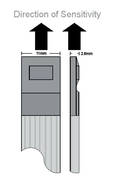 The sensor is at the end of an eight-wire cable that is normally four feet long, but other custom lengths are available. The sensor is “axial”, which means it detects the component of the field that’s in the same direction as the cable points (see arrow photo). The meter reads negative when the sensor is pointing toward the south pole of a magnet and positive toward north. The small active area of the sensor is in the center of the dark square.
