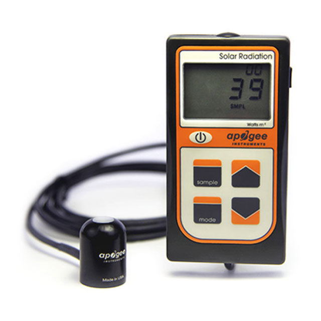 The MP-200 has a hand-held meter, attached via cable, that displays and stores measurements in W m-2. The sensor incorporates a silicon-cell photodiode with a rugged, self-cleaning sensor housing design. Typical applications include shortwave radiation measurement in agricultural, ecological, and hydrological weather networks and solar panel arrays.