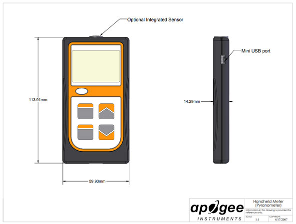 The meter has a sample and log mode, and will record an integrated daily total in MJ m-2 d-1. Sample mode will record up to 99 manual measurements. Log mode will power the meter on/off to make a measurement every 30 seconds. Every 30 minutes the meter will average the sixty 30 second measurements and record the averaged value to memory. The meter can store up to 99 averages, once full it will start to overwrite the oldest measurement with new ones. An integrated daily total will be recorded from the 48 averaged measurements (making a 24 hr period). Sample and log measurements can be reviewed on the LCD display or by downloading the data to a computer, however, the integrated daily total can only be viewed by downloading the data to a computer. Downloading data to a computer requires the AC-100 communication cable (a standard USB cable will not work) and ApogeeAMS software.