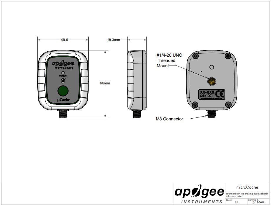 The new AT-100 microCache (μ Cache) micro recorder is a rugged, independent battery powered device that can collect more than 400000 data points, and use our free Apogee Connect application to connect your sensor to your iOS or Android device through Bluetooth. The application allows you to perform real-time measurements, set custom data recording intervals, monitor daylight integration and draw charts, ensure light cycles, download data sets, and more.