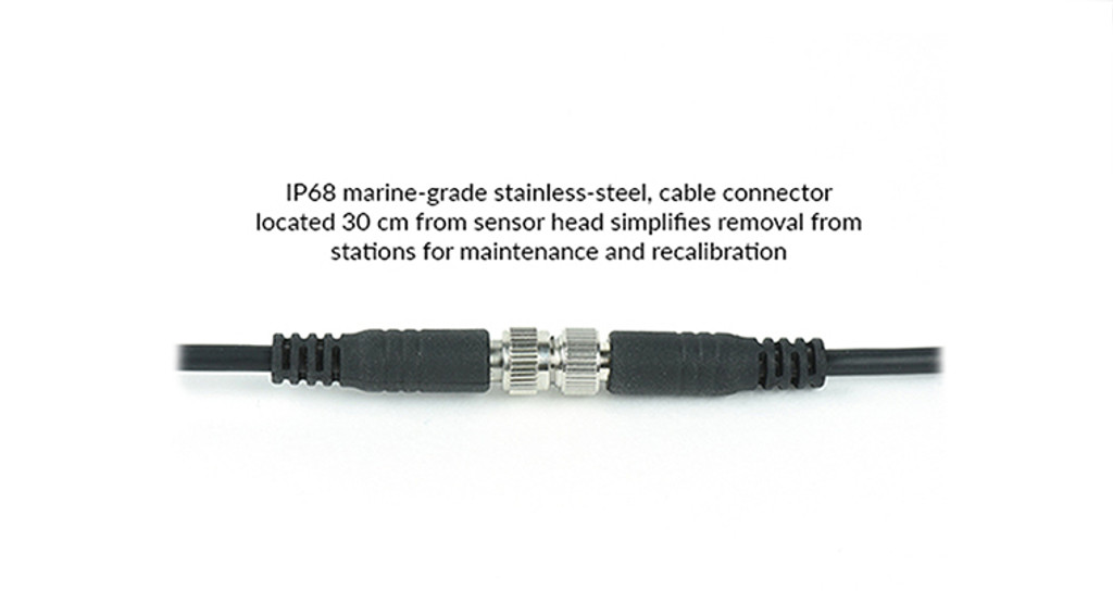 The SP-230 (All-season) is a heated pyranometer with a 0.2 W heater to keep water (liquid and frozen) off the sensor and minimize errors caused by dew, frost, rain, or snow blocking the optical path. Sensor includes IP68 marine-grade stainless-steel cable connector 30 cm from the head to simplify sensor removal and replacement for maintenance and recalibration.