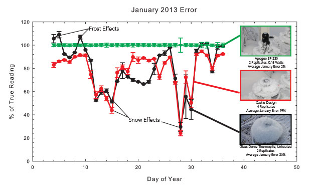 Figure 2. The effect of frost and snow accumulation for three groups of pyranometers in Logan UT, expressed as a percentage of true reading. Castle design and unheated thermopile sensors averaged a 20% error for the month with a maximum error of 80%. Data for Figure 1 is from day 12.