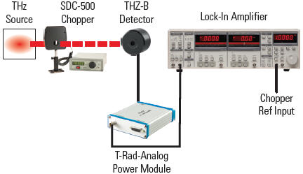 This is another analog set-up option that we recommend if you have to measure very low power levels (i.e. less than 5 ?W) where the signal may be buried in the broadband noise. The voltage output of the analog THZ-B-DA detector, powered by our T-RAD-ANALOG, is routed to the Lock-In Amplifier input, and the Sync Output of our SDC-500 Chopper is connected to the reference input. The Lock-In Amplifier will lock on the chopping frequency and you can dial in a long integrating time and measure a very low RMS voltage. The voltage divided by our Voltage Responsivity (V/W) equals the power of the source.