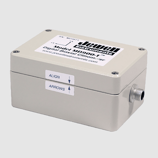 The biaxial model MD900-T is an economical digital clinometer with powerful firmware features. User programmable settings include AUTO-zero (tare), baud and output rate, sample averaging, and more. Output is RS-232 or RS-422 (RS-485 full-duplex). The MD900-T easily integrates with a variety of GPS receivers and supports Trimble TCM, NMEA XDR, BAE, and Ashtech output protocols. Units ship standard with 6-ft. hook-up cable and a 100-240VAC power transformer. Use the MD900T for industrial pitch and roll measurement, marine piling, dredging and construction systems, platform leveling, geotechnical monitoring, and more.