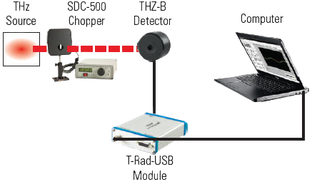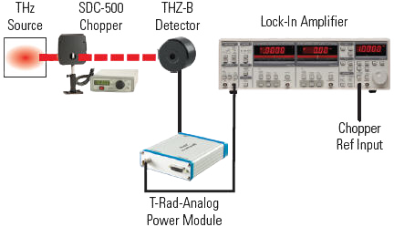 This is another analog set-up option that we recommend if you have to measure very low power levels (i.e. less than 5 μW) where the signal may be buried in the broadband noise. The voltage output of the analog THZ-B-DA detector, powered by our T-RAD-ANALOG, is routed to the Lock-In Amplifier input, and the Sync Output of our SDC-500 Chopper is connected to the reference input. The Lock-In Amplifier will lock on the chopping frequency and you can dial in a long integrating time and measure a very low RMS voltage. The voltage divided by our Voltage Responsivity (V/W) equals the power of the source.